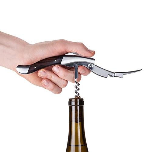 Supplemental length and weight endow this corkscrew with added power. The tool is fashioned from solid stainless steel with a double-hinged arm, sharp foil blade and handle inlaid with dark, polished ebony wood.
