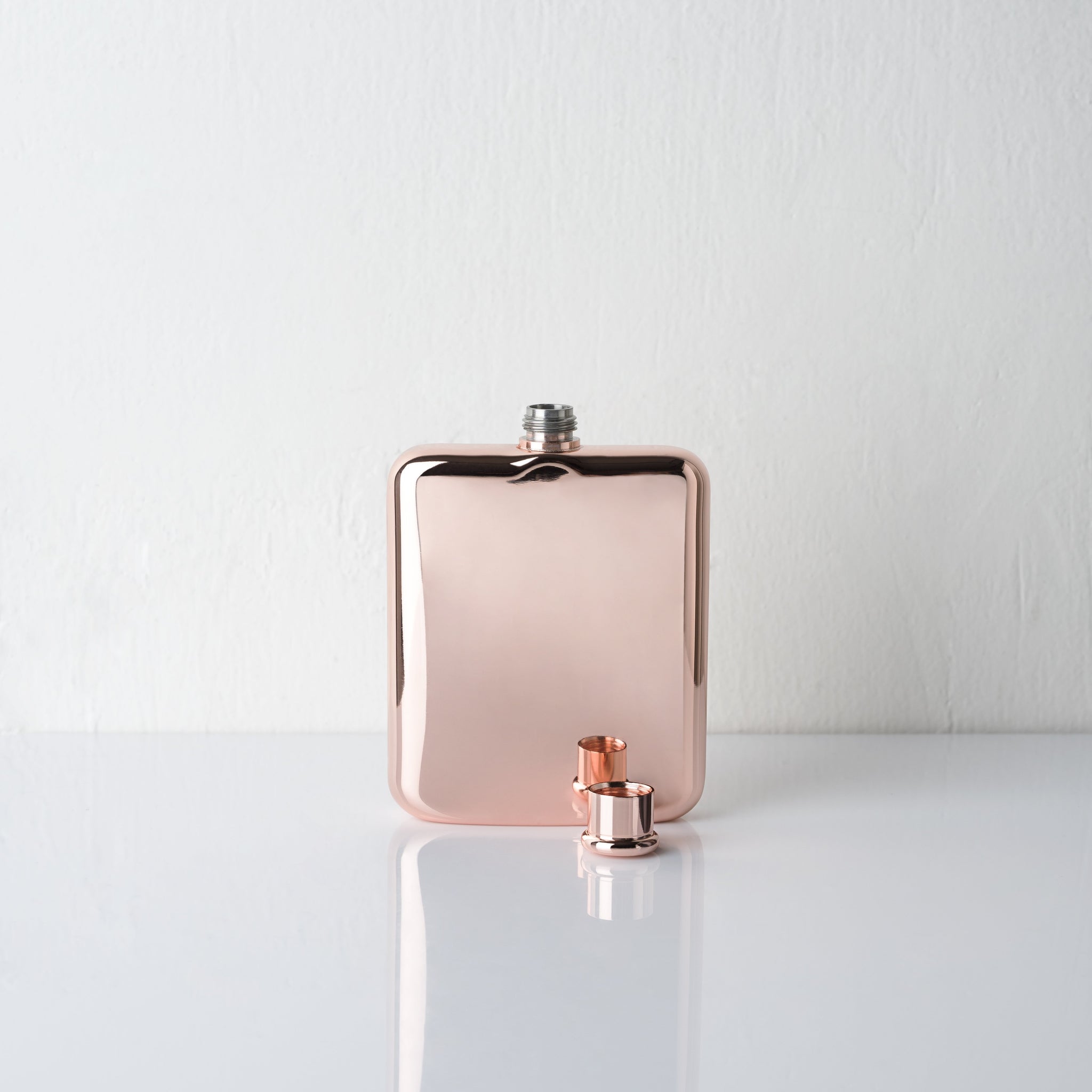 Curious how even the best liquor tastes better from a bright metallic flask. Plated in resplendent polished copper, each radiant six-ounce vessel is liquid-tight and crowned with a weighty, equally lustrous cap to hold any liquor you desire.