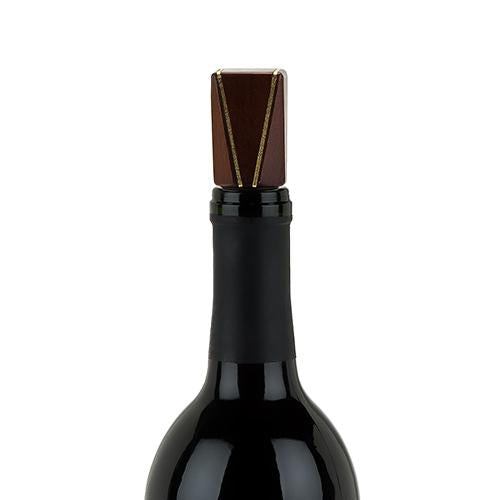 A solid portion of rich acacia wood is split, sanded and polished to precision, then inlaid with two slices of stainless steel plated in gold to make a true statement bottle stopper. BULLET POINT ON FRONT: "Gold Plated"