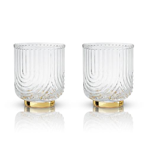 Polished gold and draping glass swathe the surface of this double old fashioned duo, adding a vestige of the Gilded Age to an already elevated set of glassware. Fashioned from high-quality glass, each tumbler accommodates 12 oz, making them exquisite vessels for your favorite carefully crafted cocktails.